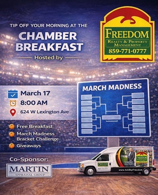 Freedom Realty Chamber Breakfast Freedom Realty Chamber Breakfast Images Gallery Image × Freedom Realty Martin Appraisal Chamber Breakfast Set a Reminder Enter your email address below to receive a reminder message. Email address Select the amount of Days before the event -- Select Days Before Event -- 1 Day 2 Days 3 Days 1 Week Captcha Validation Please complete the Captcha Submit Date and Time Tuesday Mar 17, 2026 8:00 AM - 9:30 AM EDT Tuesday, March 17 8 AM - 9:30 AM Location 624 W Lexington Ave Winchester, KY Fees/Admission Free for Chamber members Contact Information Greg Wood Set a Reminder Enter your email address below to receive a reminder message. Email address Select the amount of Days before the event -- Select Days Before Event -- 1 Day 2 Days 3 Days 1 Week Captcha Validation Please complete the Captcha Submit Share × Print Email Add to Calendar Facebook Twitter LinkedIn Tell a Friend × Select Calendar Type × Google Yahoo iCal (Outlook, Apple, or other)